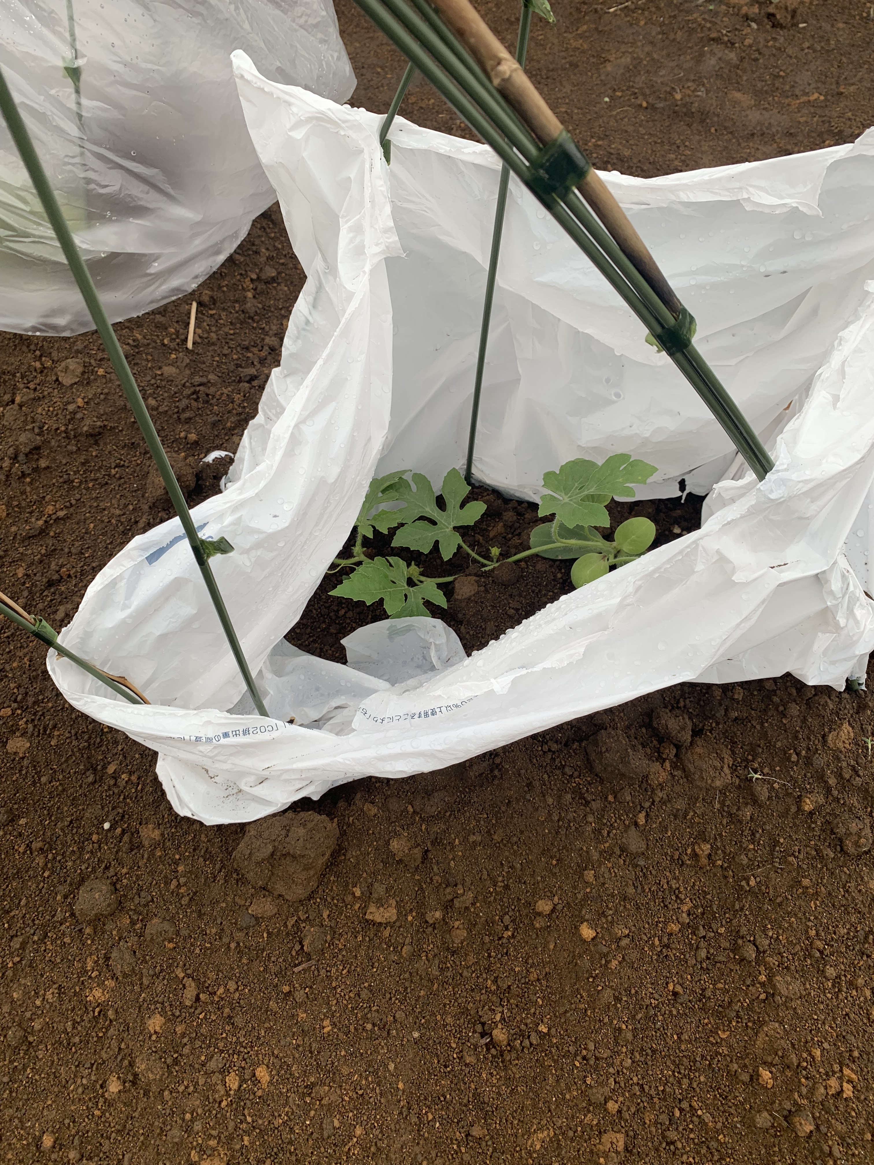 スタッフがスイカの苗を植えてくれました。ビニール袋は風防止とのこと。今週は気温も高くなるので外した方が良いのかなぁ?スイカが無事に実りますように!^^